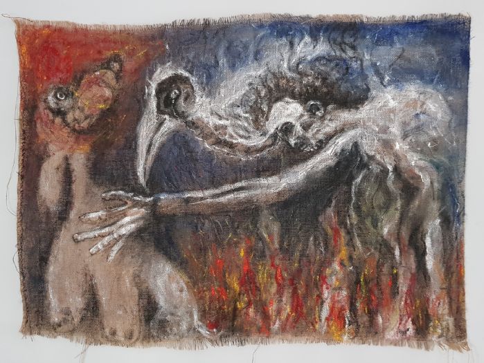 Untitled, 2019, Acrylic on Jute Fabric,74X101 cm.